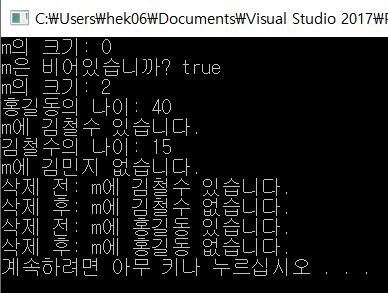 cout << "삭제 후: " << ((m.find("홍길동") != m.end()) ? "m에 홍길동 있습니다." : "m에 홍길동 없습니다.") << endl;