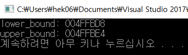 일단 lower_bound와 upper_bound 함수의 반환값을 알아보기 위해서 그냥 출력해보면