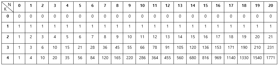 따라서 dp[3][4] = dp[2][4] + dp[2][3] + dp[2][2] + dp[2][1] + dp[2][0] 이다.