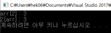 2[arr]과 같은 요상한 코드를 실행해도 컴파일러는 컴파일할 때 *(2 + arr)로 하기 때문에 아무런 문제가 없는 것이다.