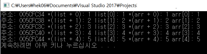 cout << "주소: " << list + i << " *(list + " << i << "): " << *(list + i) << " list[" << i << "]: " << list[i] << " *(arr + " << i << "): " << *(arr + i) << " arr[" << i << "]: " << arr[i] << endl;