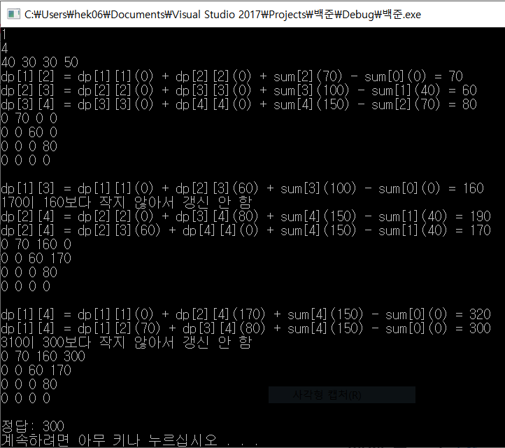 이차원 배열 dp[i][j]에는 i번째 챕터부터 j번째 챕터까지 합치는데에 드는 최소비용을 저장한다.