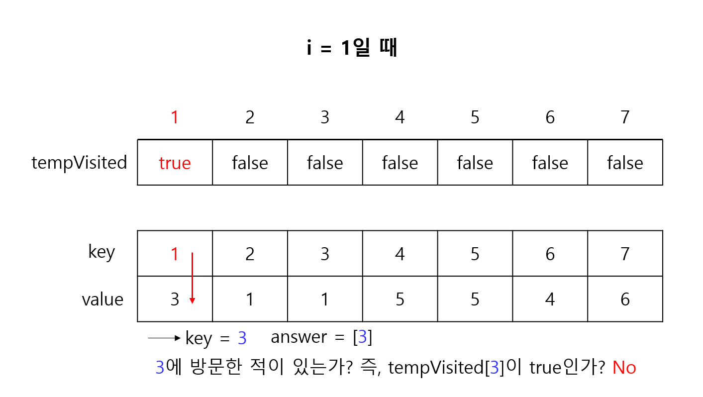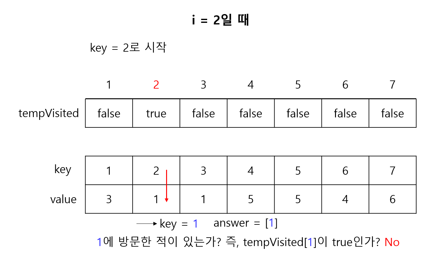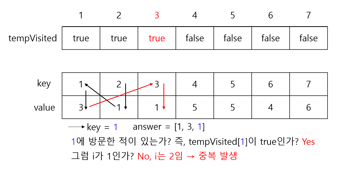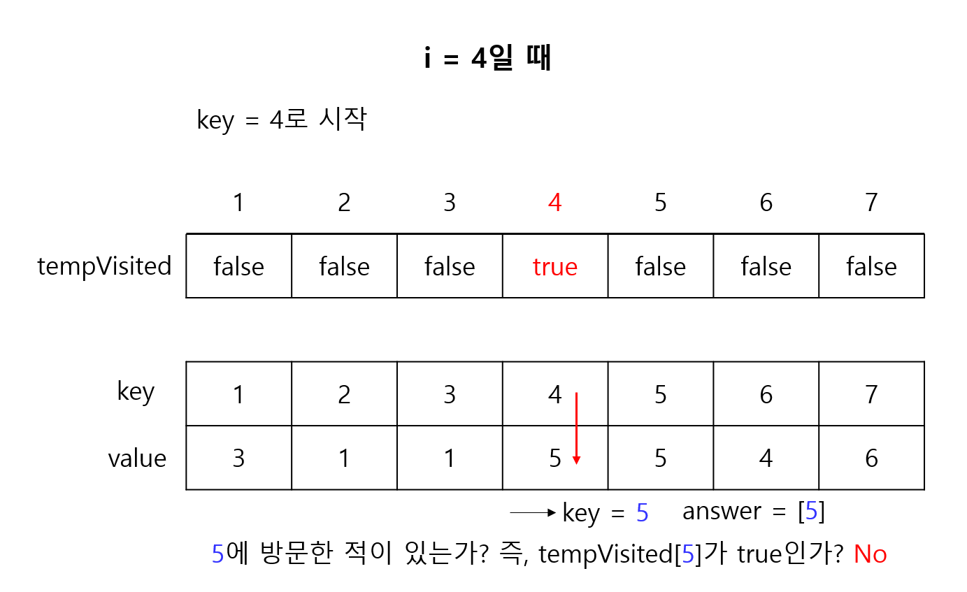 그 다음에 i = 1부터 시작해서 i = N까지 반복을 하였다. 예를 들어 i = 1이라면 map[1]에 있는 value를 key에 대입하여 이제 map[1]이 key가 된다. 그 다음에 또 그 key를 가지고 map[key]로 간다. 그 다음에도 또 반복을 하는 것이다. 그런데 이미 방문했던 곳이라면 사이클이 생겼거나 숫자가 중복된다는 것이다. 숫자가 중복됐다는 것은 잘못된 것이다. 왜냐하면 첫번째 줄은 1부터 N이므로 숫자가 중복될 수가 없다. 사이클이 생긴 곳은 visited에 방문했다고 표시한다. 이런 식으로 사이클이 생긴 것들끼리 합치면 정답이 된다. 예를 들어 i = 5일 때 map[5]에 들어있는 숫자가 5라도 이것은 사이클이 발생한 것이다.