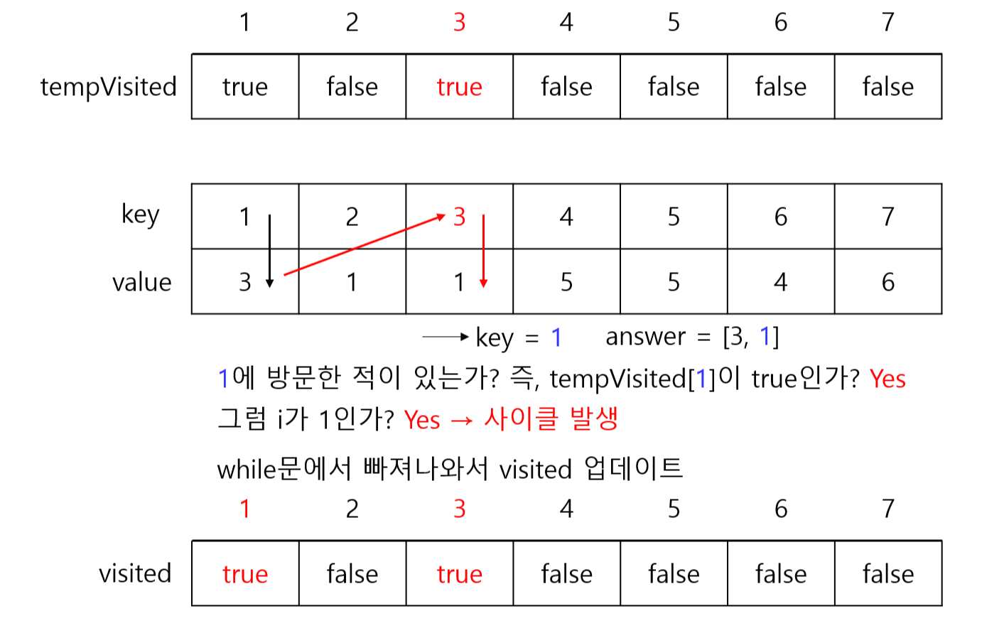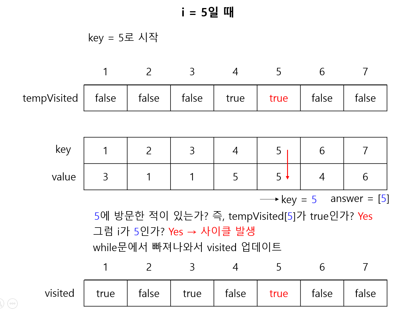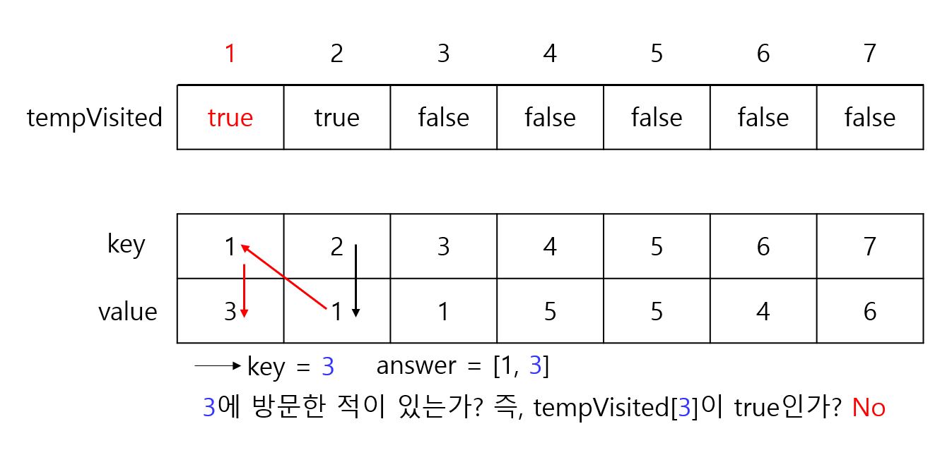 그 다음에 i = 1부터 시작해서 i = N까지 반복을 하였다. 예를 들어 i = 1이라면 map[1]에 있는 value를 key에 대입하여 이제 map[1]이 key가 된다. 그 다음에 또 그 key를 가지고 map[key]로 간다. 그 다음에도 또 반복을 하는 것이다. 그런데 이미 방문했던 곳이라면 사이클이 생겼거나 숫자가 중복된다는 것이다. 숫자가 중복됐다는 것은 잘못된 것이다. 왜냐하면 첫번째 줄은 1부터 N이므로 숫자가 중복될 수가 없다. 사이클이 생긴 곳은 visited에 방문했다고 표시한다. 이런 식으로 사이클이 생긴 것들끼리 합치면 정답이 된다. 예를 들어 i = 5일 때 map[5]에 들어있는 숫자가 5라도 이것은 사이클이 발생한 것이다.