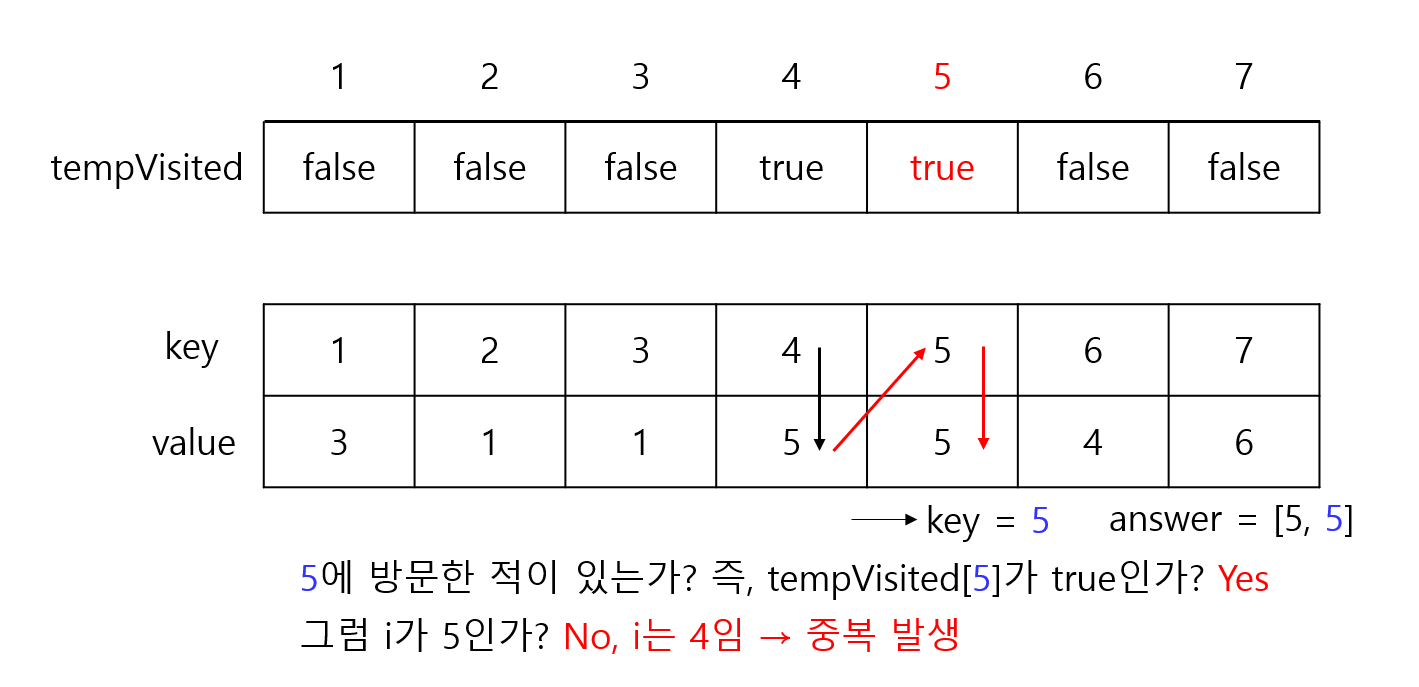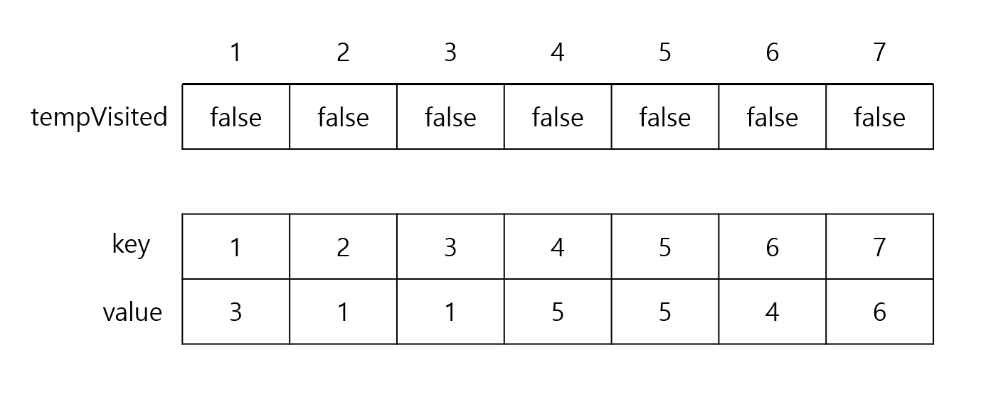 주어진 정수들이 3, 1, 1, 5, 5, 4, 6일 때 tempVisited와 map은 다음과 같다.