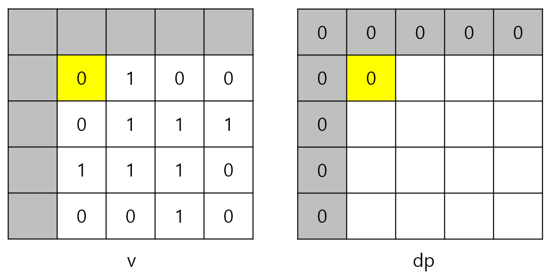 i = 1, j = 1일 때는 v[1][1]이 0이므로 dp[1][1]도 0이다.