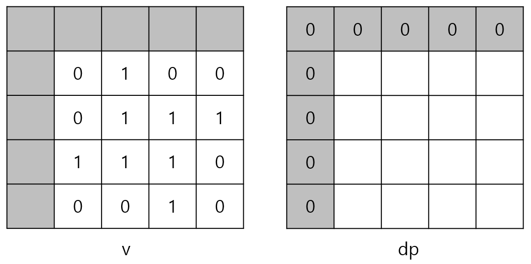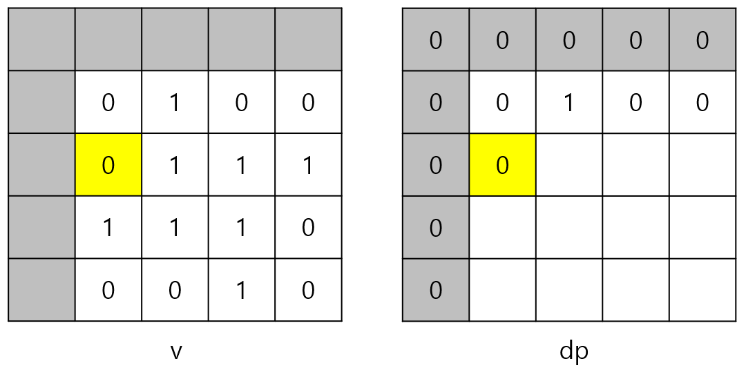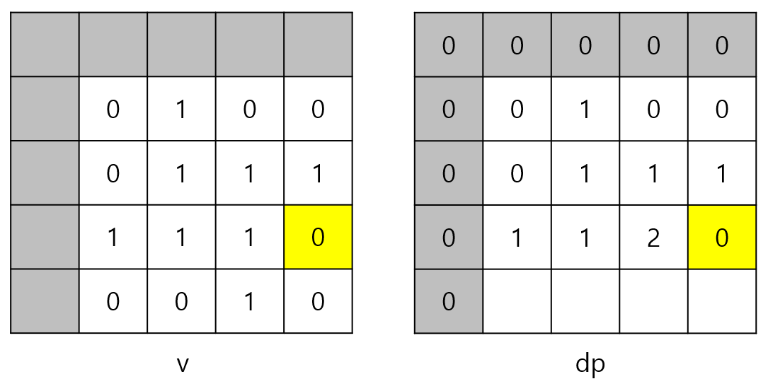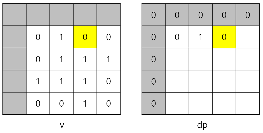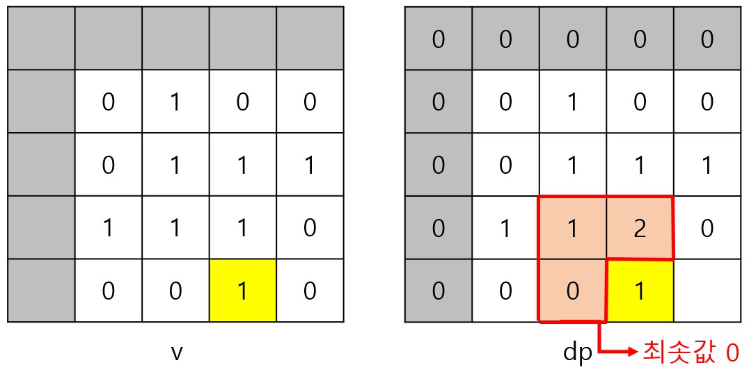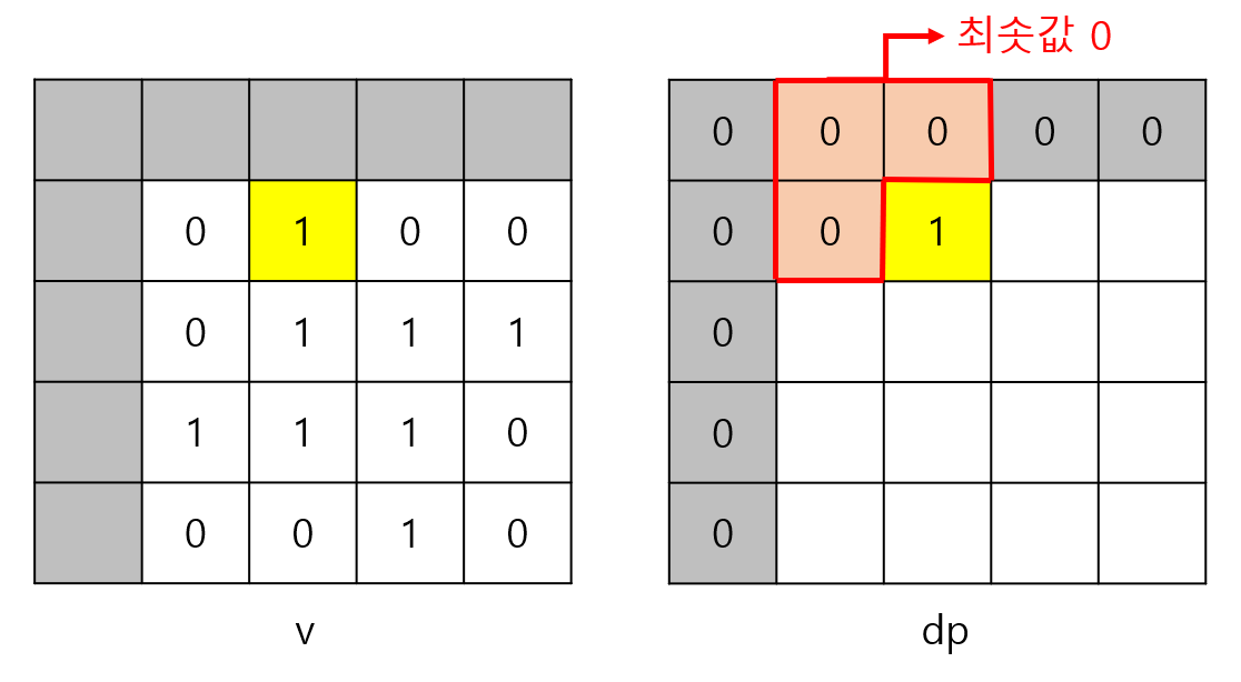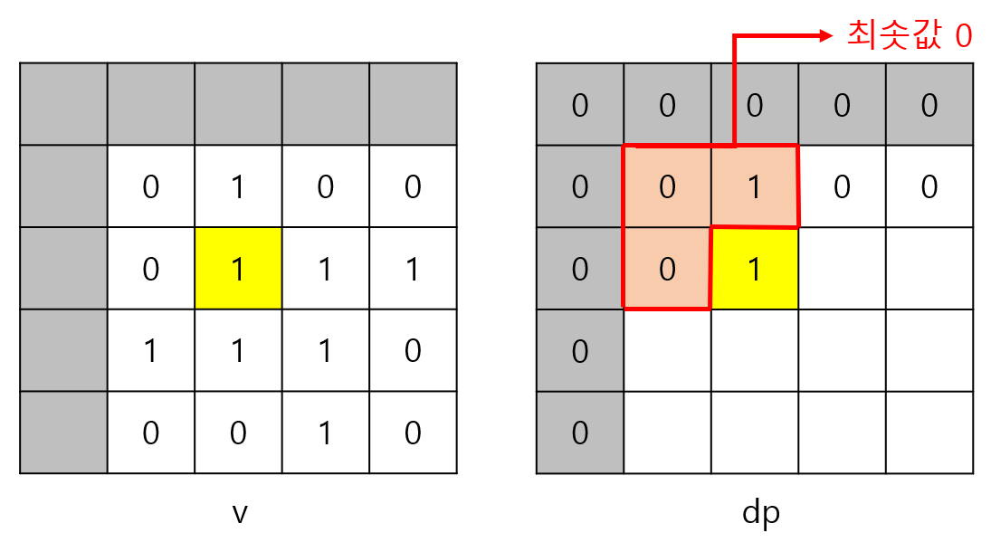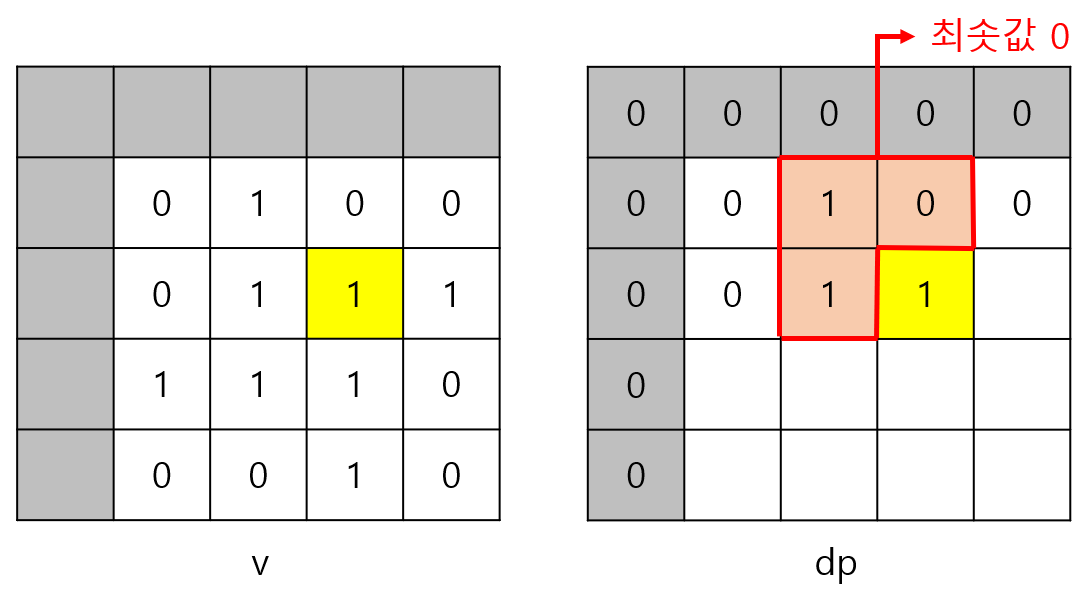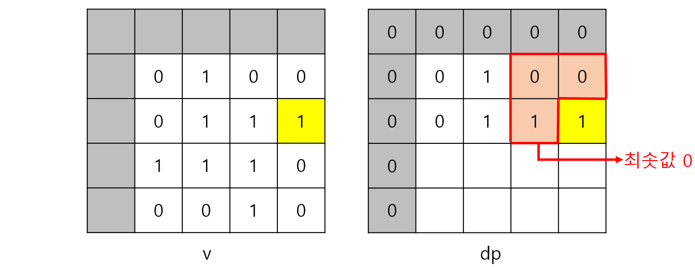 v[i][j]가 0이면 1로 된 정사각형을 만들 수 없으므로 v[i][j]가 0이면 dp[i][j]는 반드시 0이다.