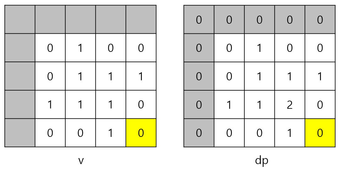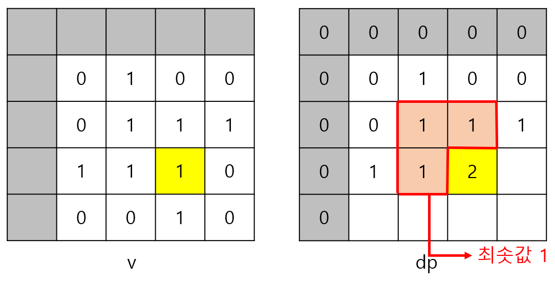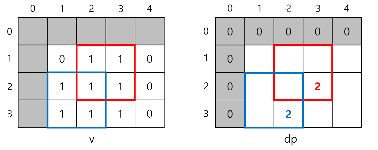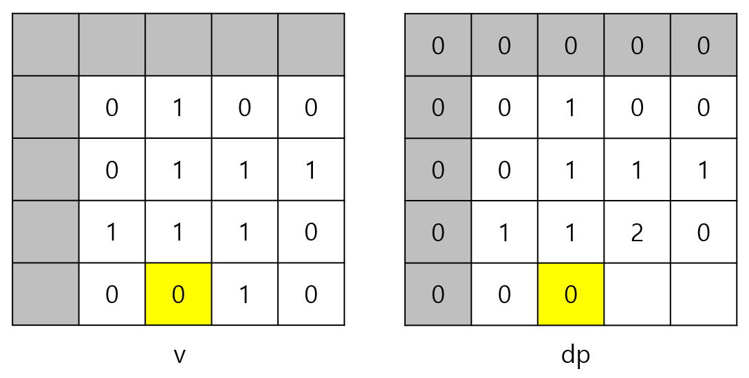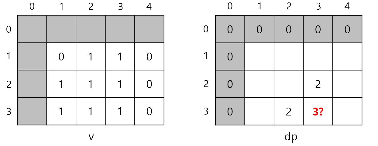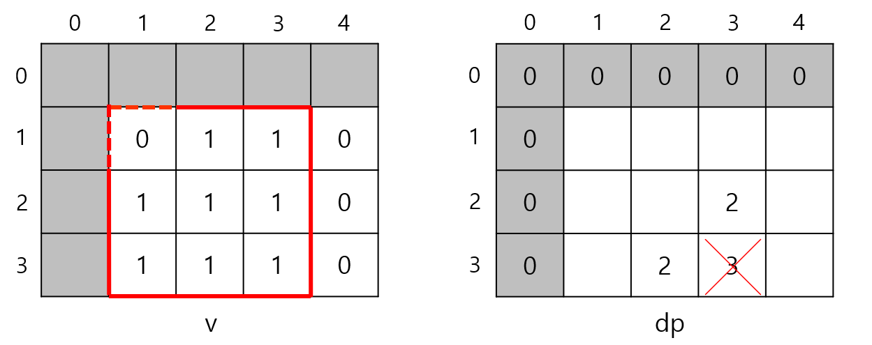 v[1][1]이 0이므로 변의 길이가 3인 정사각형은 만들 수 없다. 따라서 dp[3][3]은 3이 될 수 없다. v[2][2]가 1이기 때문이다.