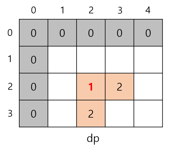 i = 2, j = 2일 때는 dp[1][1], dp[1][2], dp[2][1]의 최솟값이 0이므로