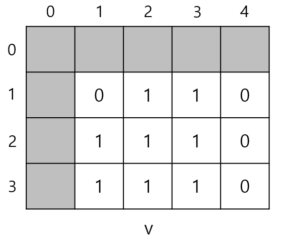 i = 3, j = 4일 때는 v[3][4]이 0이므로 dp[3][4]도 0이다.