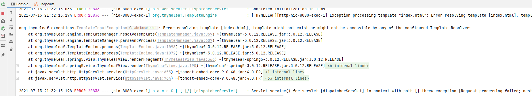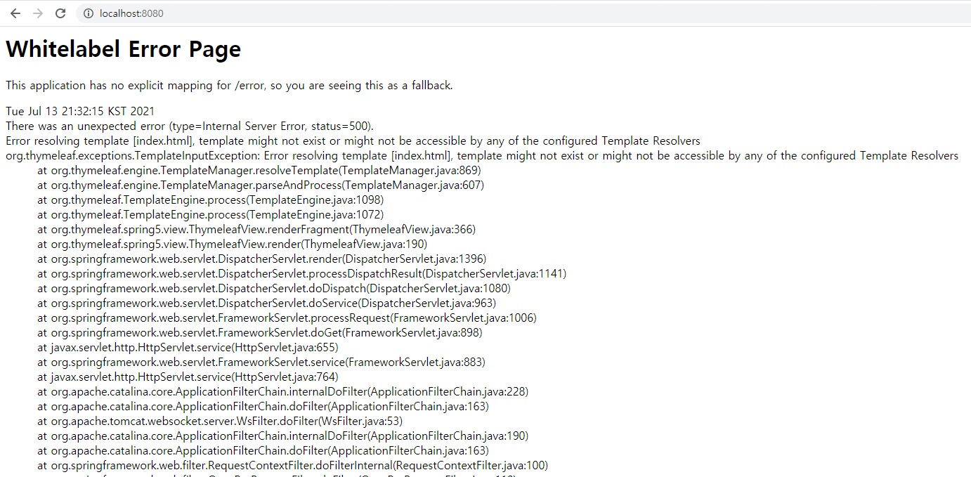 2021-07-13 21:32:15.194 ERROR 20836 --- [nio-8080-exec-1] org.thymeleaf.TemplateEngine : [THYMELEAF][http-nio-8080-exec-1] Exception processing template "index.html": Error resolving template [index.html], template might not exist or might not be accessible by any of the configured Template Resolvers