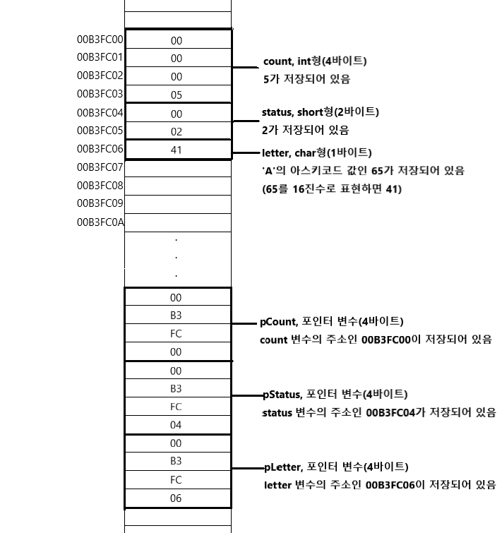 count는 int 타입이기 때문에 4칸에 걸쳐서 5가 저장되고 status는 short 타입이기 때문에 두 칸에 걸쳐서 2가 저장되고 letter은 char 타입이기 때문에 한 칸에 'A'의 아스키코드 값인 65(16진수로 41)가 저장된다. (메모리는 1바이트마다 주소가 부여되어 있기 때문에 메모리 한 칸은 1바이트라고 생각하면 된다.)