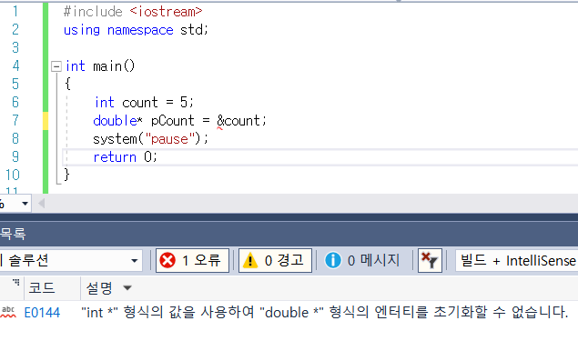 이렇게 컴파일 에러가 난다. 따라서 반드시 변수의 타입과 포인터의 타입을 일치시켜야 한다.