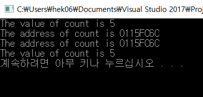 따라서 cout << *pCount;나 cout << count;나 똑같이 5를 출력한다.