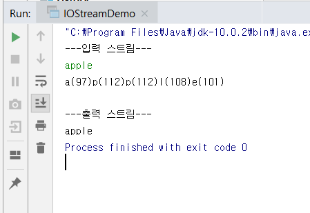 이 코드에서는 InputStream, OutputStream 객체를 따로 만들지는 않았고 표준 입력 장치인 System.in과 표준 출력 장치인 System.out을 사용했다. 키보드로부터 입력을 받고 모니터에 출력을 하겠다는 것이다.
