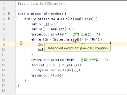 입출력 장치를 이용할 때에는 거의 IOException이 일어나기 때문에 반드시 예외 처리를 해 줘야 한다.