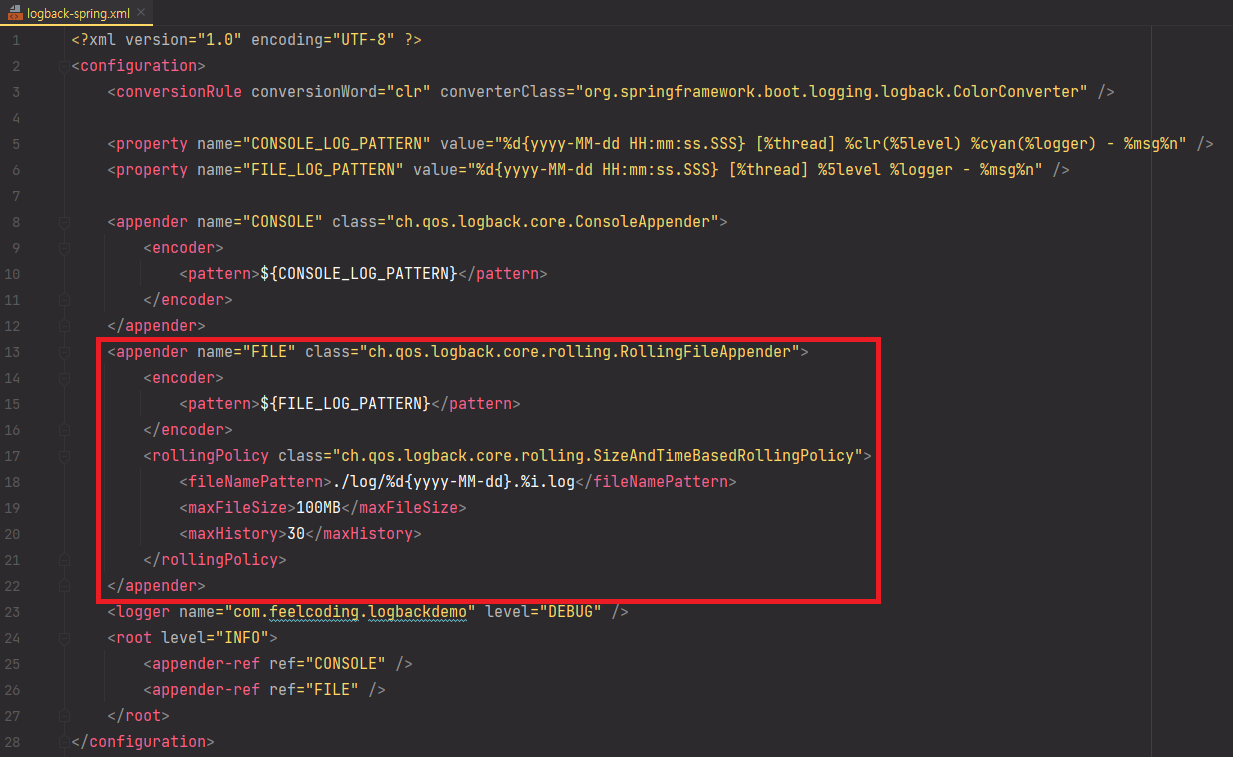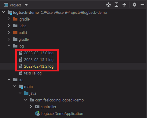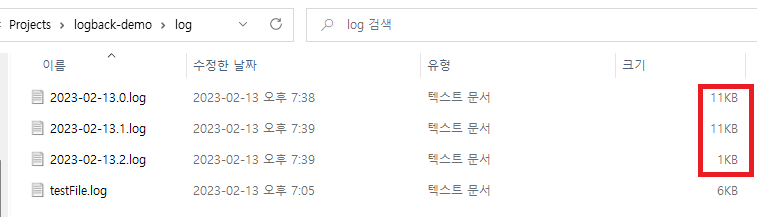예를 들어 2023-02-13.0.log 파일에 로그가 많이 써져서 100MB가 넘으면 2023-02-13.1.log 파일에 기록을 하고, 그 다음 2023-02-13.2.log, 2023-02-13.3.log, ... 이런 식으로 파일 이름을 짓겠다는 것입니다. 그리고 30일 후인 2023년 3월 15일에 이 파일은 삭제될 것입니다.