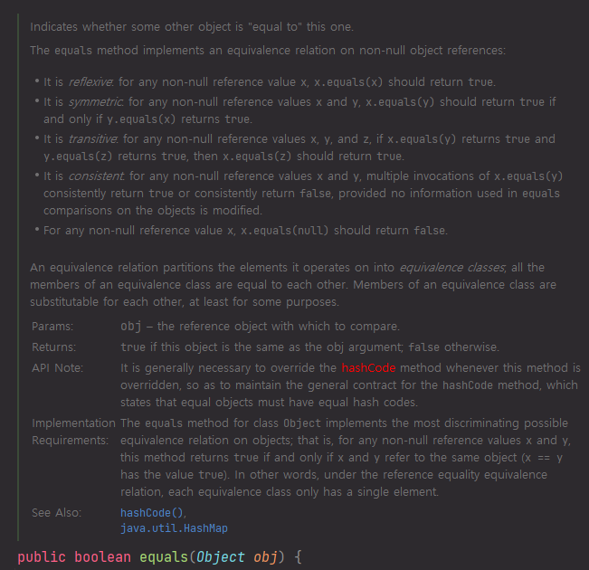 다른 객체가 이것과 같은지 아닌지를 나타냅니다. equals() 메소드는 null이 아닌 참조 객체에 대해 비교를 수행합니다. 재귀적이다. null이 아닌 참조 타입 객체 x가 있을 때 x.equals(x)는 true를 반환해야 한다. 대칭적이다. null이 아닌 참조 타입 객체 x. y가 있을 때 y.equals(x)가 true일 때만 x.equals(y)가 true여야 한다. 전이적이다. null이 아닌 참조 타입 객체 x, y, z가 있을 때, x.equals(y)가 true이고 y.equals(z)가 true이면 x.equals(z)는 true를 반환해야 한다. 일관적이다. null이 아닌 참조 타입 객체 x, y가 있을 때 x.equals(y)를 여러 번 호출해도 일관적으로 계속 true를 반환하거나 일관적으로 계속 false를 반환해야 한다. null이 아닌 참조 타입 객체 x가 있을 때, x.equals(null)은 false를 리턴해야 한다.