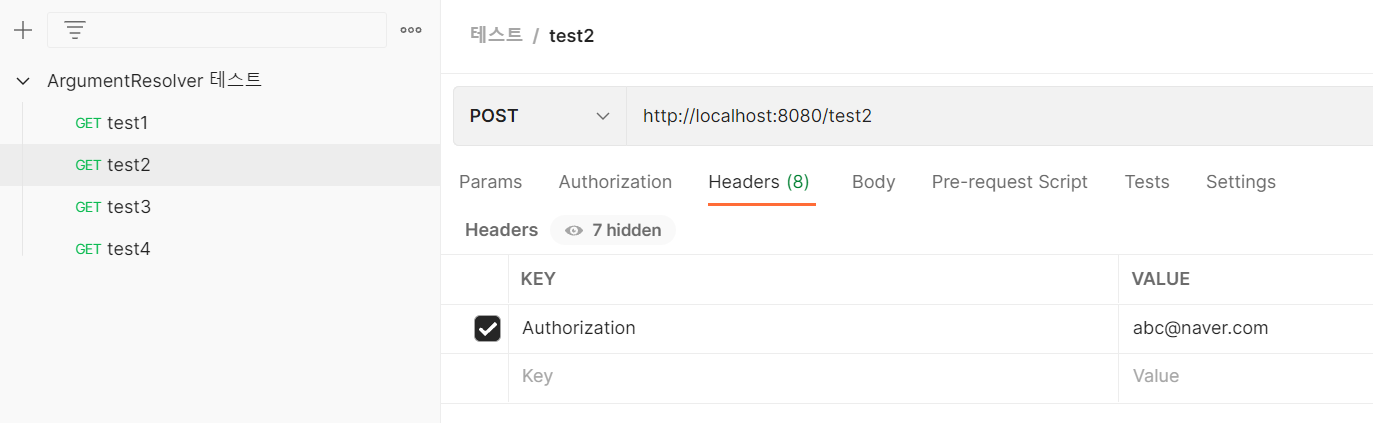이렇게 헤더에는 Authorization이라는 이름으로 사용자의 이메일을 넣어주고 GET /test1, POST /test2, GET /test3, GET /test4 API들을 차례로 호출해보겠습니다.