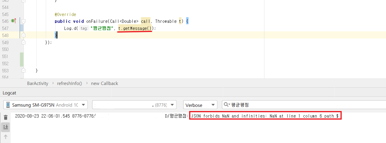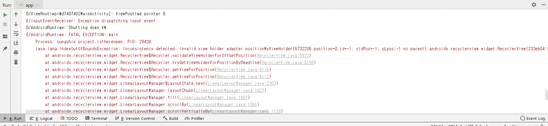 하지만 종종 이렇게 LogCat에 필터를 적용해서 검색할 수 있는 창이 안 보일 때가 있다.