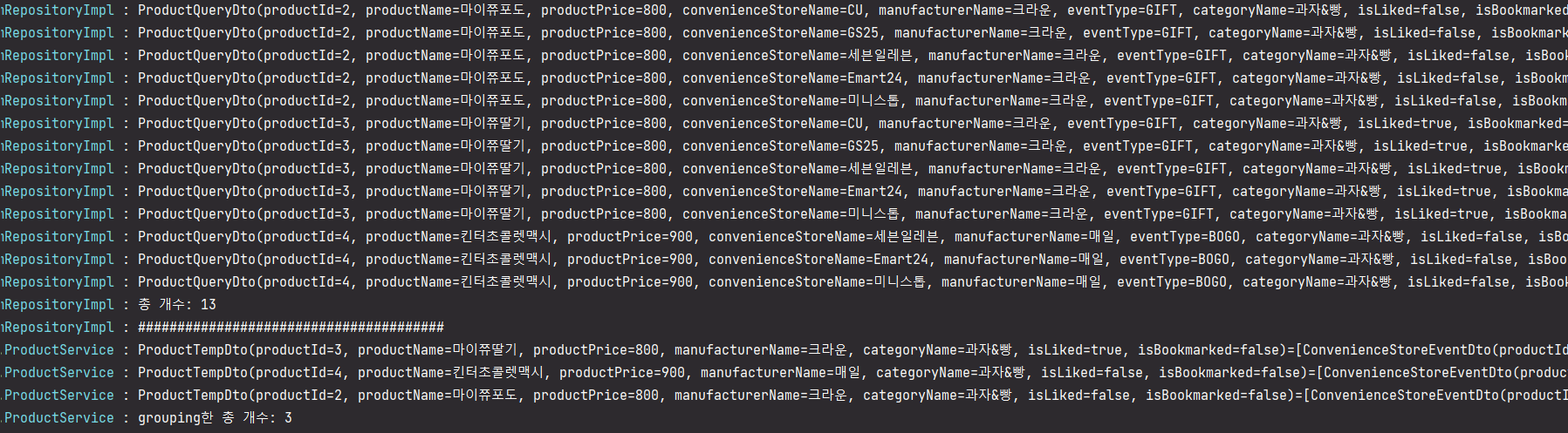 이렇게 판매 편의점+이벤트 정보까지 가져온 뒤 productId 기준으로 grouping을 해서 List를 만들어줍니다.