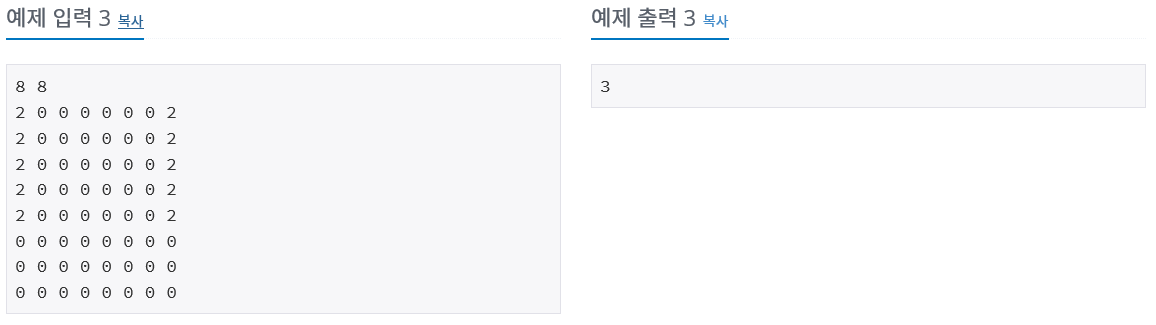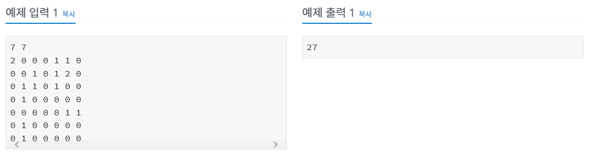 인체에 치명적인 바이러스를 연구하던 연구소에서 바이러스가 유출되었다. 다행히 바이러스는 아직 퍼지지 않았고, 바이러스의 확산을 막기 위해서 연구소에 벽을 세우려고 한다. 연구소는 크기가 N×M인 직사각형으로 나타낼 수 있으며, 직사각형은 1×1 크기의 정사각형으로 나누어져 있다. 연구소는 빈 칸, 벽으로 이루어져 있으며, 벽은 칸 하나를 가득 차지한다. 일부 칸은 바이러스가 존재하며, 이 바이러스는 상하좌우로 인접한 빈 칸으로 모두 퍼져나갈 수 있다.