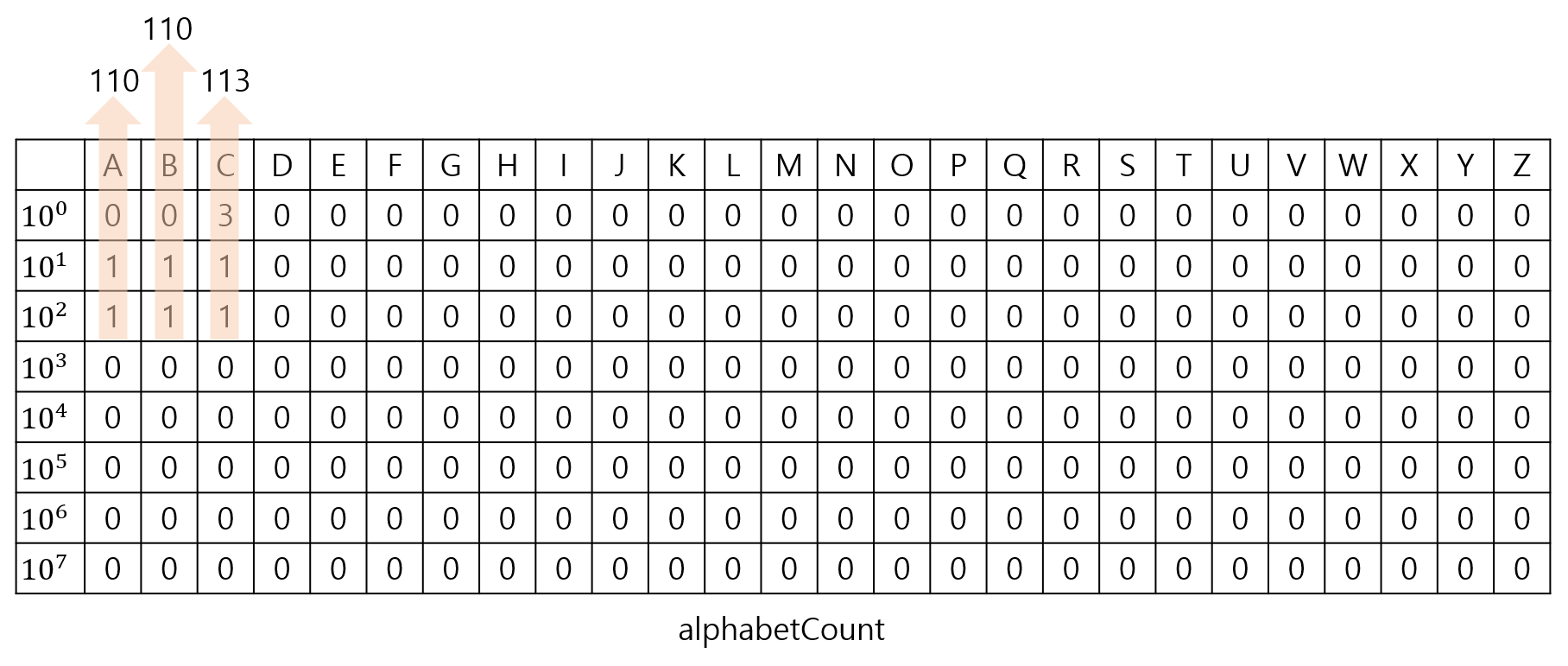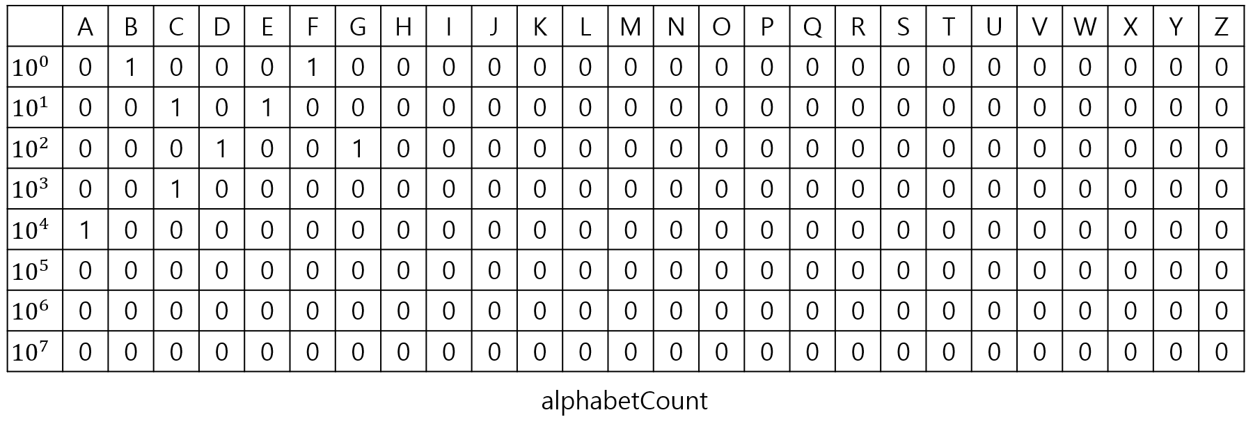 tempSum[j] += pow(10, i) * alphabetCount[i][j];