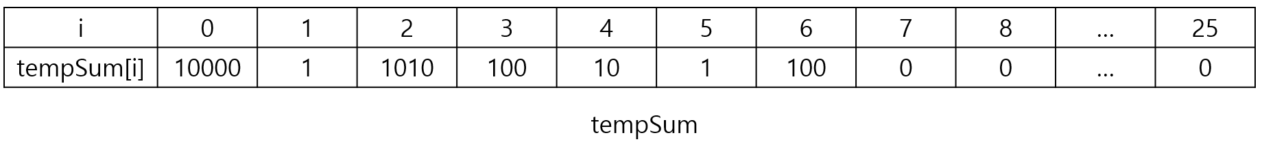 이렇게 10000, 1, 1010, 100, 10, 1, 100을 tempSum에 저장해준다.